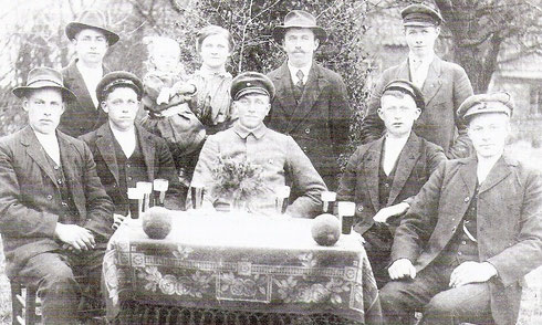 Obere Reihe, v.li.: Heinrich Fischer, Kind Martha Dirks, Katharina Dirks, Gerrit Dirks, Heinrich Rasche. Untere Reihe v.li.: Johann de Wall, Fritz Fischer, Reinhard Rogge, Hero Badberg, Rieke Janßen (M´moor).